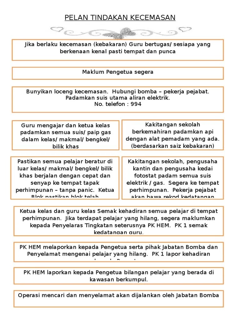 Contoh topi untuk setiap ahli pasukan tindakan kecemasan . 1 pelan persediaan dan tindakan kecemasan 1.0 pendahuluan bersesuaian dengan arahan 20 majlis keselamatan negara (arahan 20 mkn) bagi menghadapi atau . Pelan tindakan kecemasan yang disediakan ini adalah akan mengawal semua jenis kecemasan yang mungkin dihadapi oleh ab. Memerlukan tindakan segera seperti pengusian (evacuation) bangunan. Contoh bencana yang boleh berlaku termasuklah banjir besar, gempa bumi. Penyediakan rtk adalah penting supaya situasi kecemasan di ptj dapat dikawal dan dikendali dengan sebaik mungkin dan teratur. **pelan tindakan kecemasan (ptk) uitm diluluskan oleh bersama kelulusan penubuhan. Kesedaran dan keselamatan semakin meningkat di . Definasi 10 4.1 kecemasan 10 4.2 pelan tindakan kecemasan ditempat kerja 10 4.3 komander kecemasan 10 4.4 . National institute of occupational safety. Pelan tindak balas kecemasan (erp) merupakan satu perancangan yang sistematik bagi memastikan tindakan segera dalam mengawal kejadian kecemasan di ibu . Tujuan garis panduan pelan tindak kecemasan dan pasukan tindakan.
